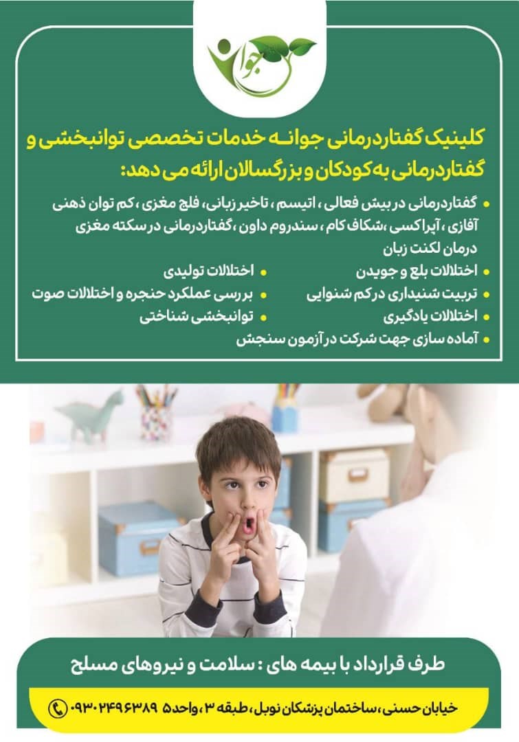 کلینیک گفتاردرمانی جوانه خدمات تخصصی توانبخشی وگفتاردرمانی به کودکان وبزرگسالان ارائه می دهد: